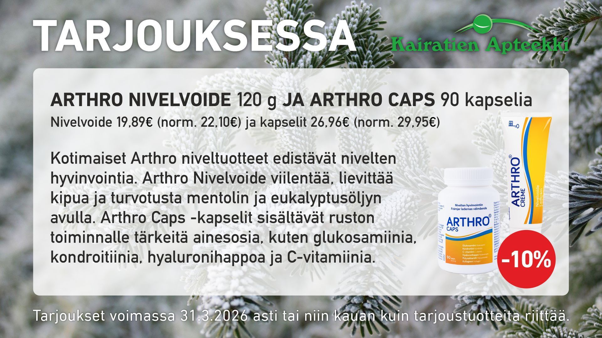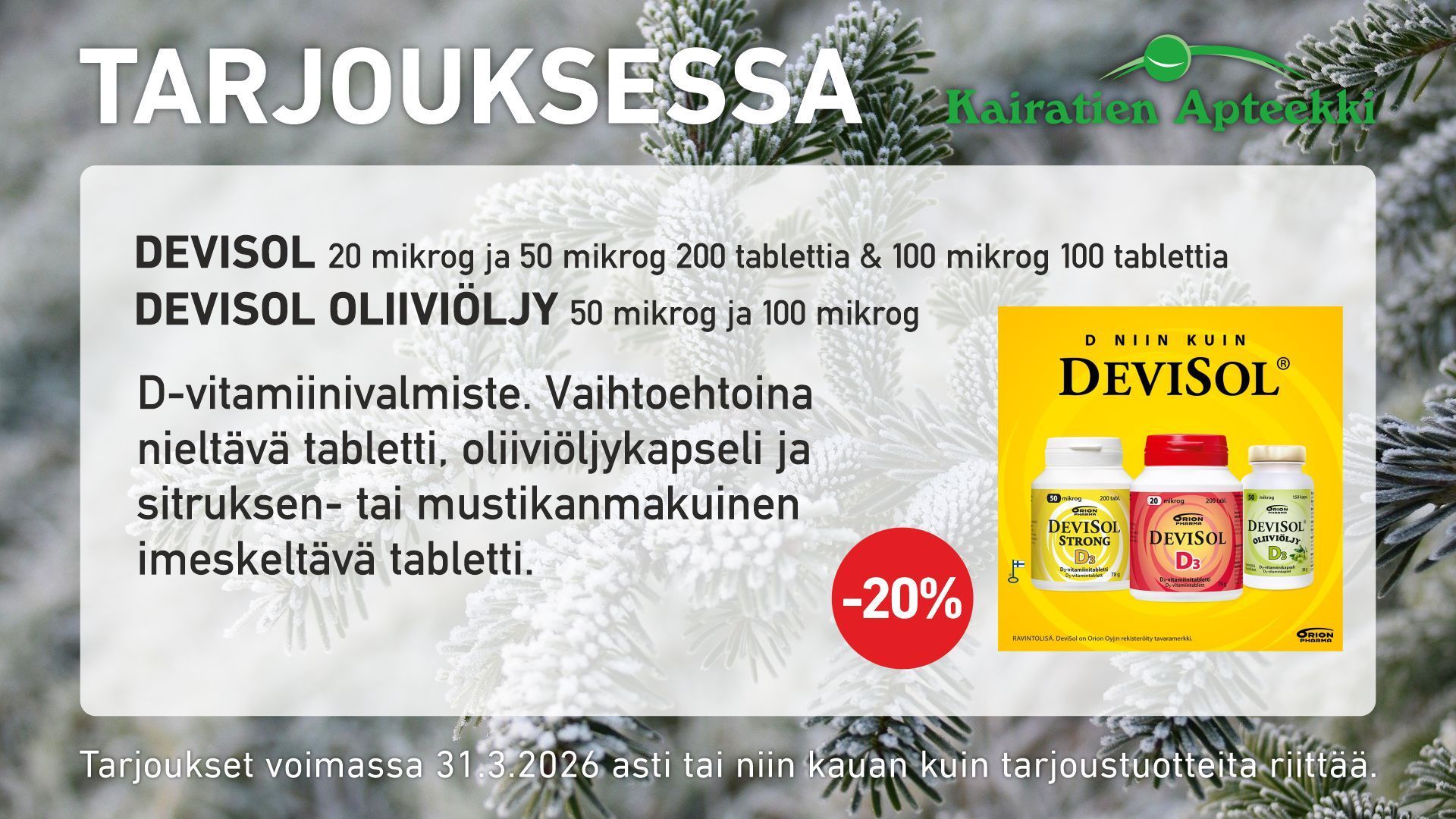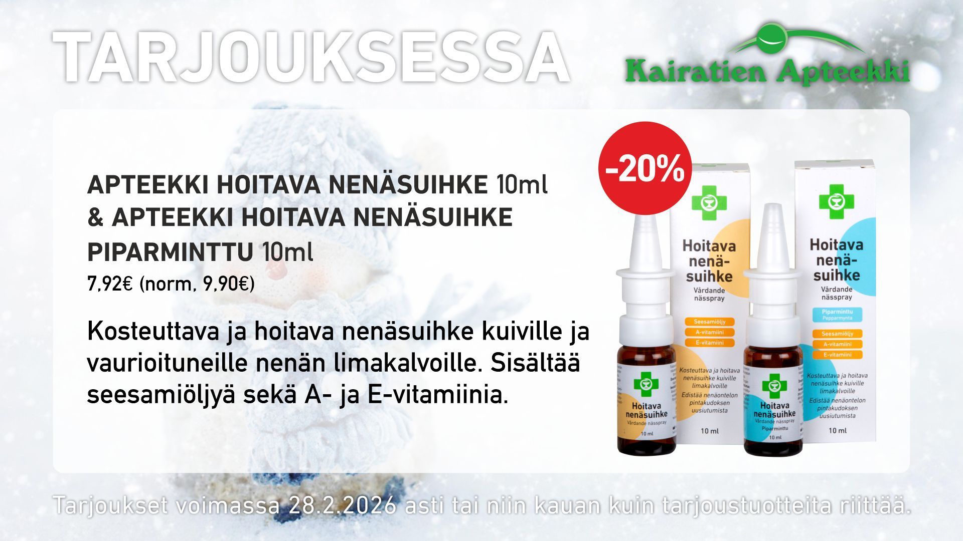 Monipuolisesta valikoimastamme löydät tuotteet terveytesi ylläpitoon sekä tukemaan jokapäiväistä hyvinvointiasi.